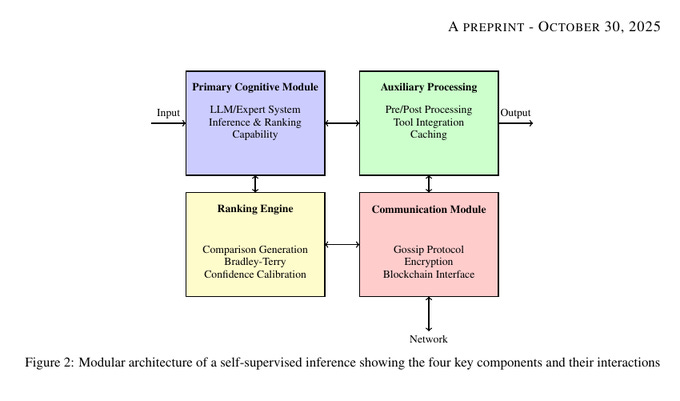 The red box moves messages across the network using gossip, encryption, and an on-chain interface for coordination. The green box cleans inputs and outputs, plugs in tools, and caches results to keep latency down. Together, these 4 parts let many small nodes argue, rank, and return one reliable answer.