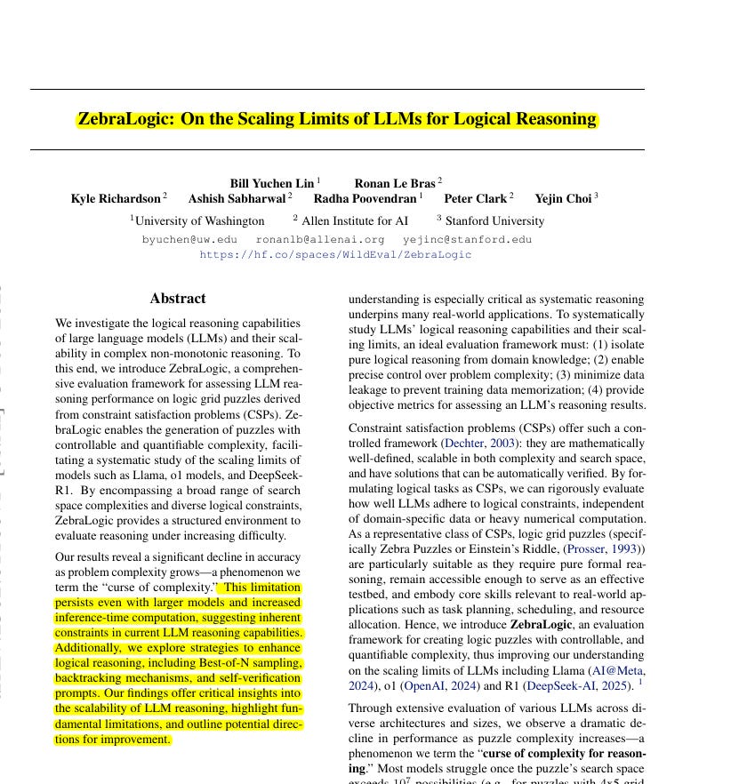📌 ZebraLogic uses Constraint Satisfaction Problems to create logic puzzles. This method offers a mathematically rigorous and scalable way to evaluate LLMs' pure logical reasoning abilities, unlike benchmarks mixed with world knowledge.