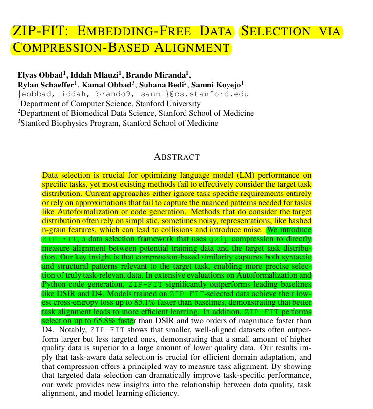 • Introduces ZIP-FIT: A framework using gzip compression to measure alignment between training data and target task